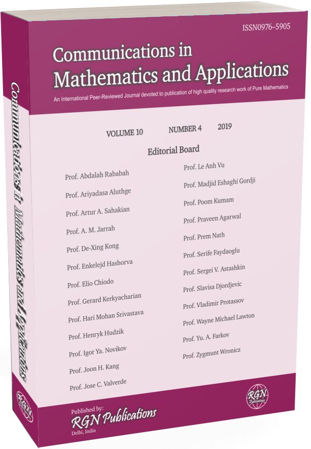 The journal “Communications in Mathematics and Applications” (CMA) is being regularly published since 2010 (eISSN 0975-8607; pISSN 0976-5905). The “Communications in Mathematics and Applications” is an international journal devoted to the publication of original and high-quality research of Pure and Applied Mathematics.